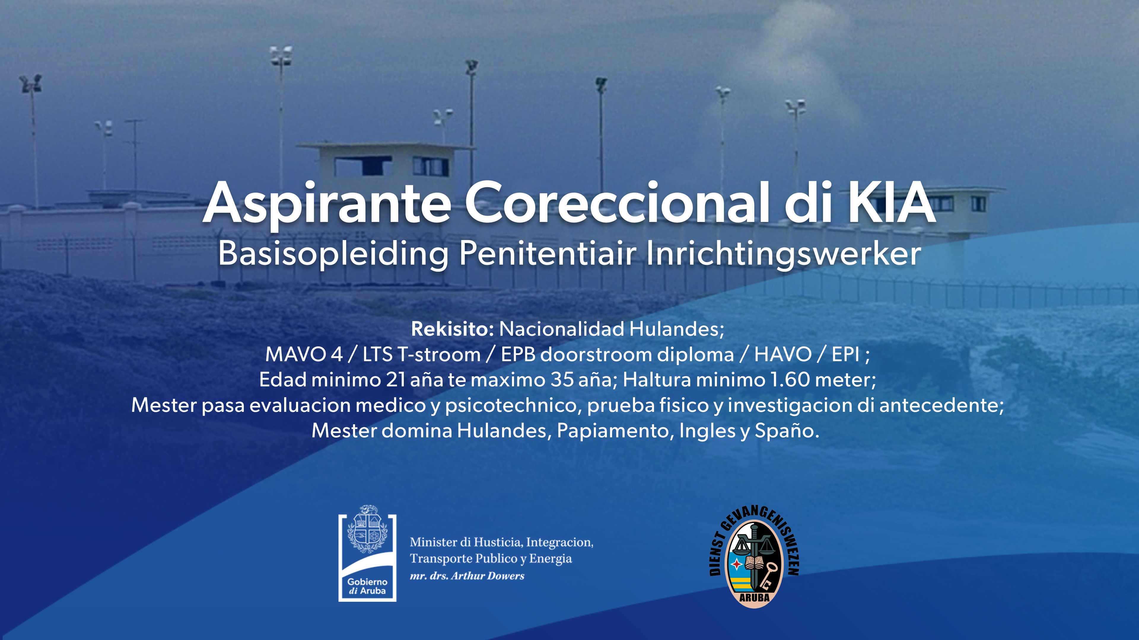 Diaranson merdia, Minister di Husticia, mr. drs. Arthur Dowers, a anuncia oficialmente durante un conferencia di prensa cu Gobierno ta habri vacatura pa candidatonan cu kier drenta den e opleiding di Aspirante Coreccional pa Instituto Coreccional KIA.