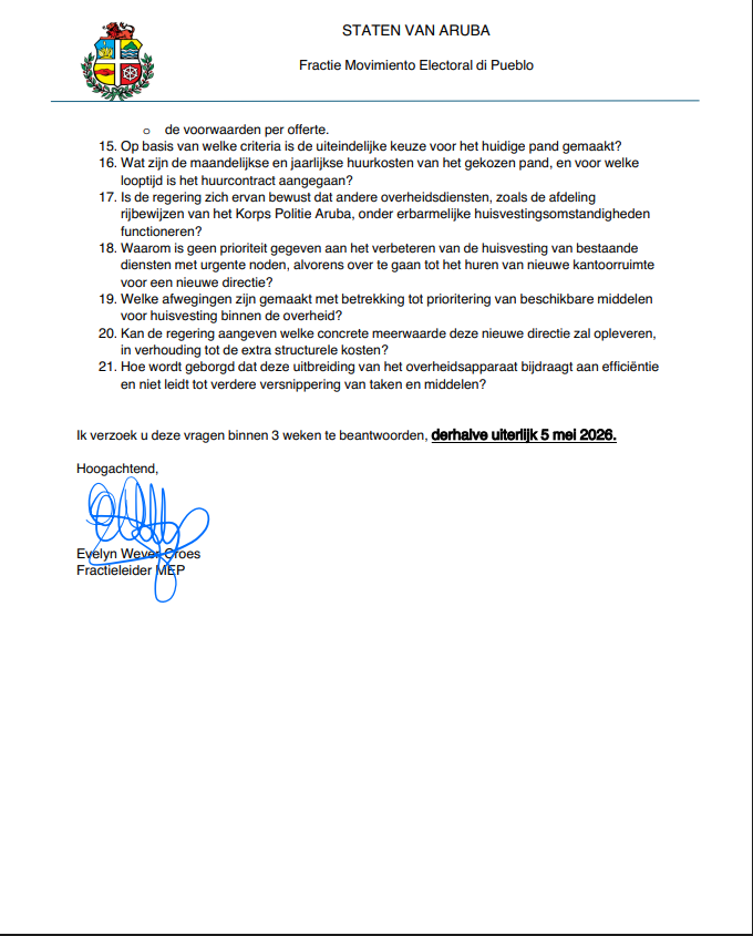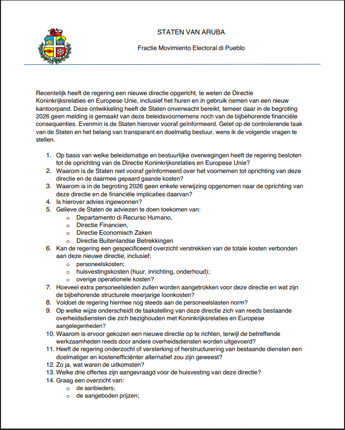 A base di esaki, Fraccion di MEP a haci preguntanan formal na gobierno pa exigi aclaracion tocante e base legal y necesidad di e creacion di e departamento. Tambe dicon no a inclui esaki den e presupuesto 2026, y tambe kico ta e costo total di personal y operacion. Tambe a haci pregunta tocante e proceso di seleccion pa e edificio huur, incluyendo e tres ofertanan cu mester pidi den casonan asina. Y principalmente kiko ta e motibonan pakico no a wordo duna prioridad na servicio cu tin necesidad urgente di mihor oficinanan.